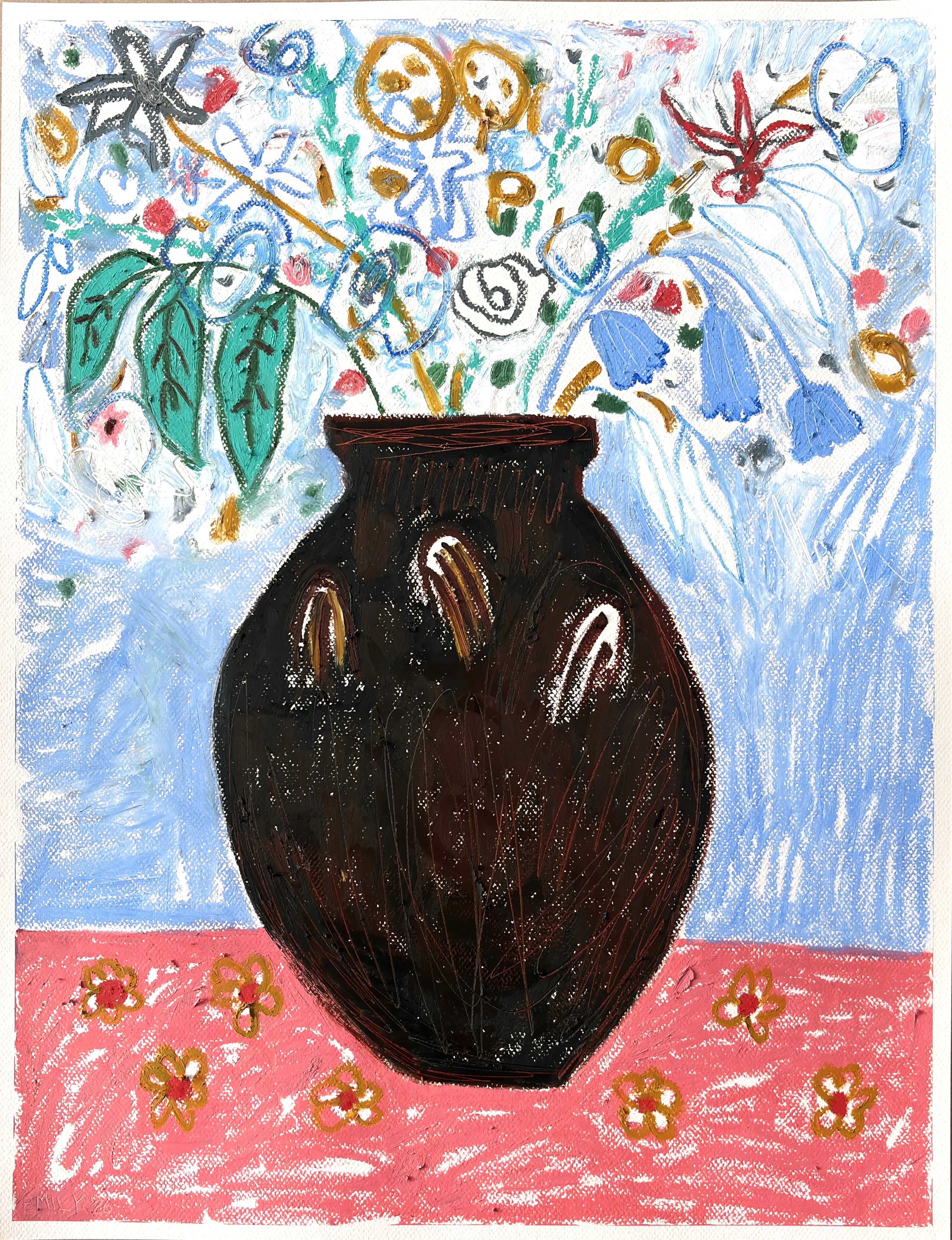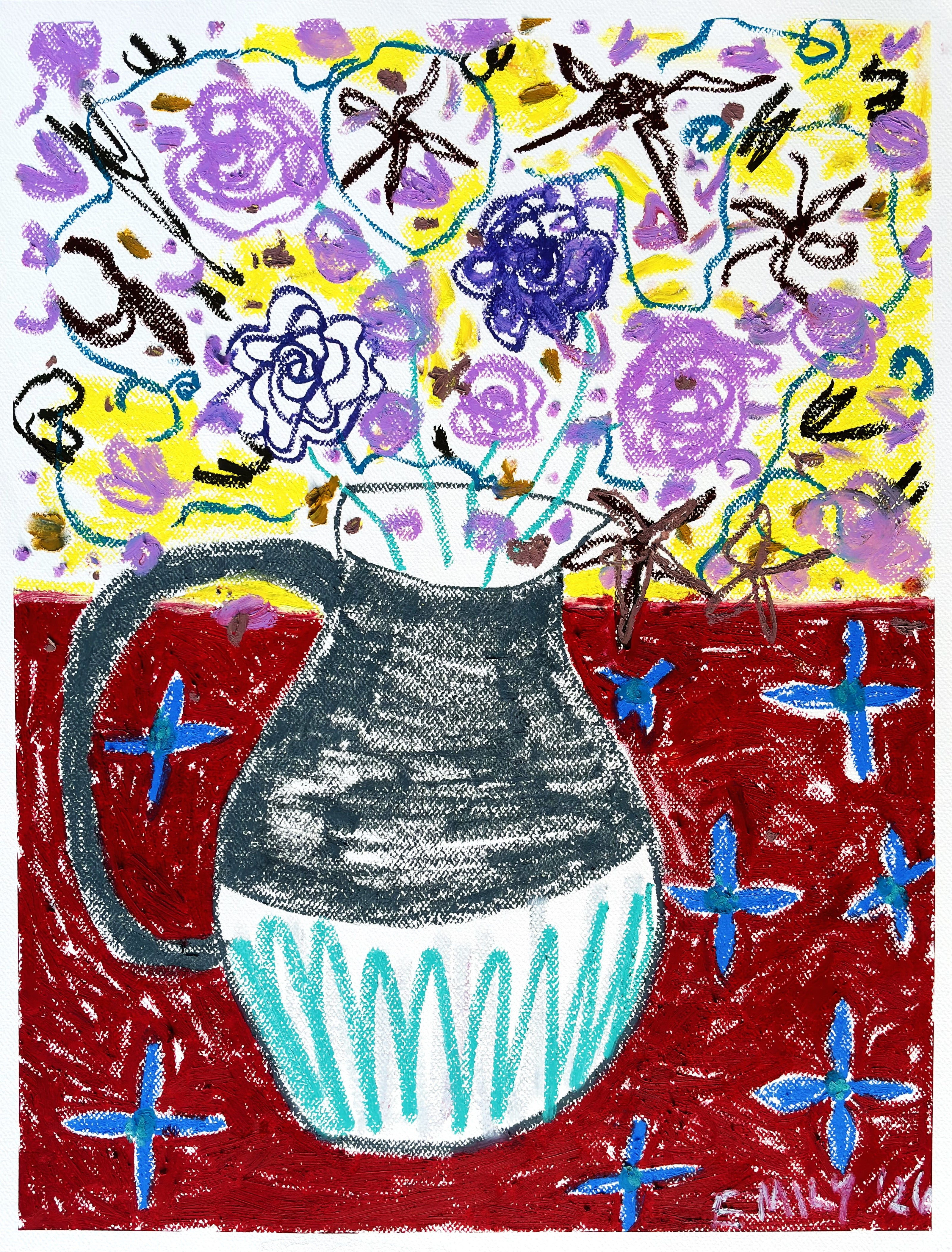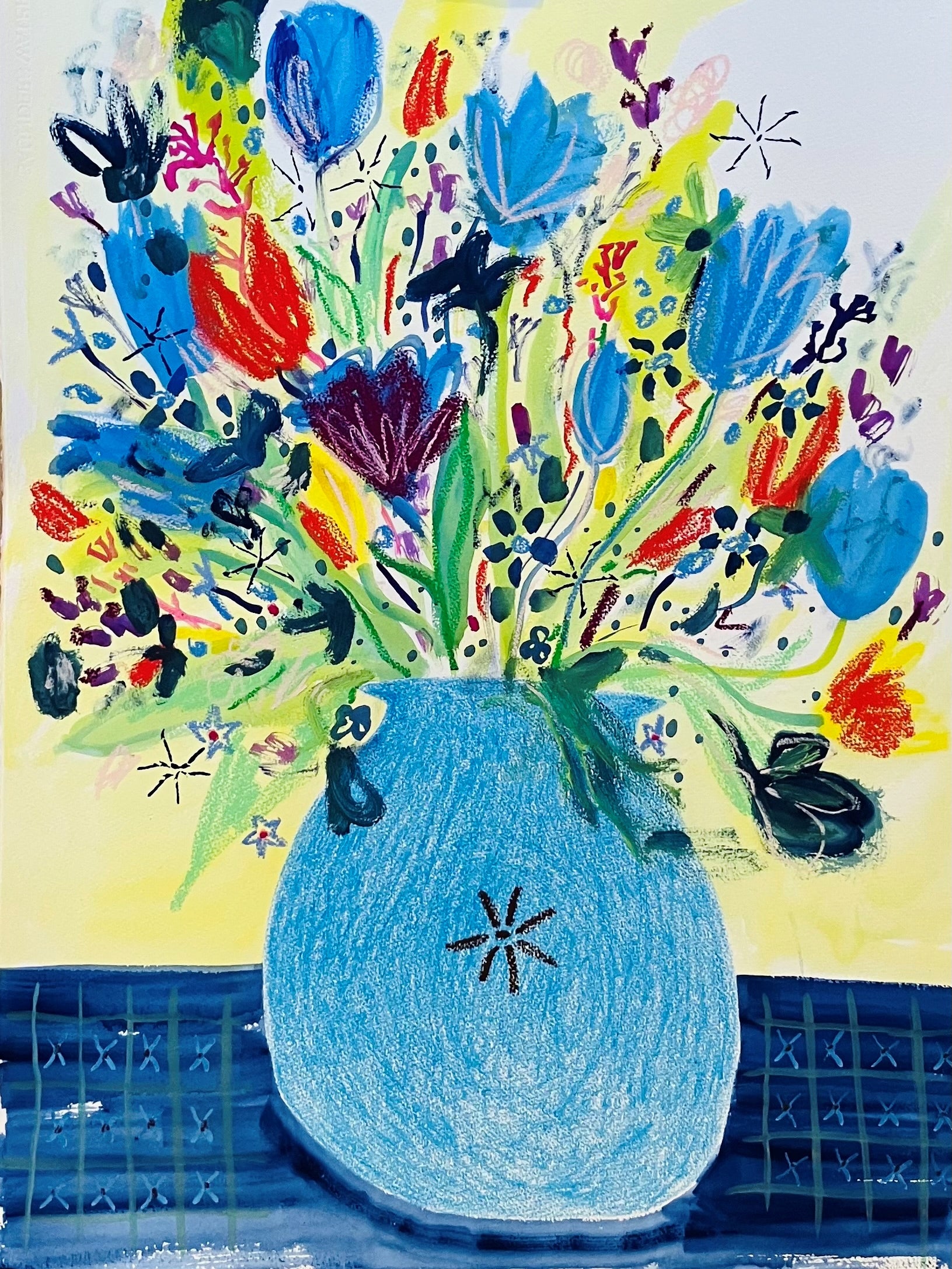 Colour, line and texture are her main areas of interest which she explores through using different mediums such as gouache, oil pastels and coloured pencils.